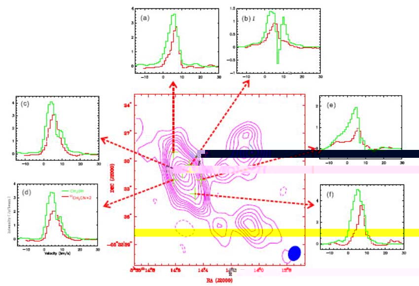 I是在引力坍縮(圖3)。在熱核MM1中測到的藍色輪廓,也表明物質内流。這些結果促進了對于大質量恒星形成的認識。